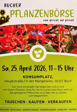 Liebe Gartenfreunde, am 25. April ab 11 Uhr findet die Bucher Pflanzenbörse statt. Hier können schöne Ableger, Setzlinge, Jungpflanzen, Kräuter, Zwiebeln usw. verkauft oder getauscht werden !